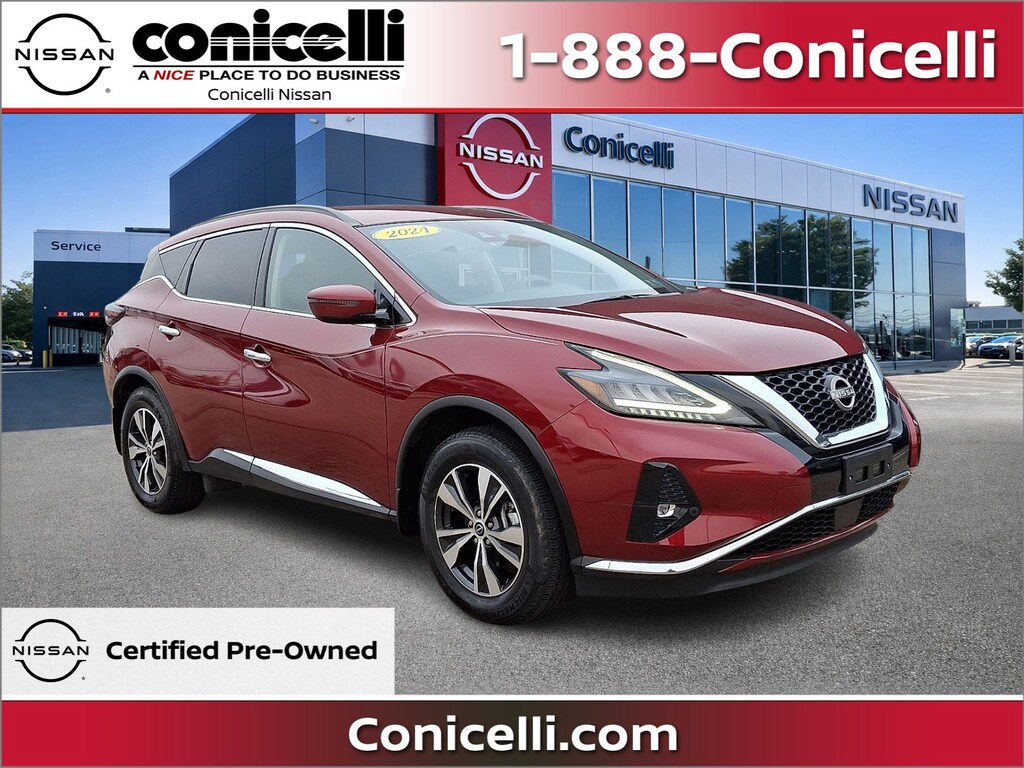 AWD, CarFax One Owner! This Nissan Murano is CERTIFIED! Low miles for a 2024! Back-up Camera, Bluetooth, This 2024 Nissan Murano SV, has a great Scarlet Ember Tintcoat exterior, and a clean Graphite interior! Heated Seats, Multi-Zone Air Conditioning, Auto Climate Control, Leather Steering Wheel Satellite Radio, Steering Wheel Controls, Aux Audio Input, Automatic Headlights Keyless Start Parking Sensors AM/FM Radio Rear Spoiler, Park Distance Control Stability Control, ABS Brakes Satellite Radio Call to confirm availability and schedule a no-obligation test drive! We are located at 1222 Ridge Pike, Conshohocken, PA 19428.