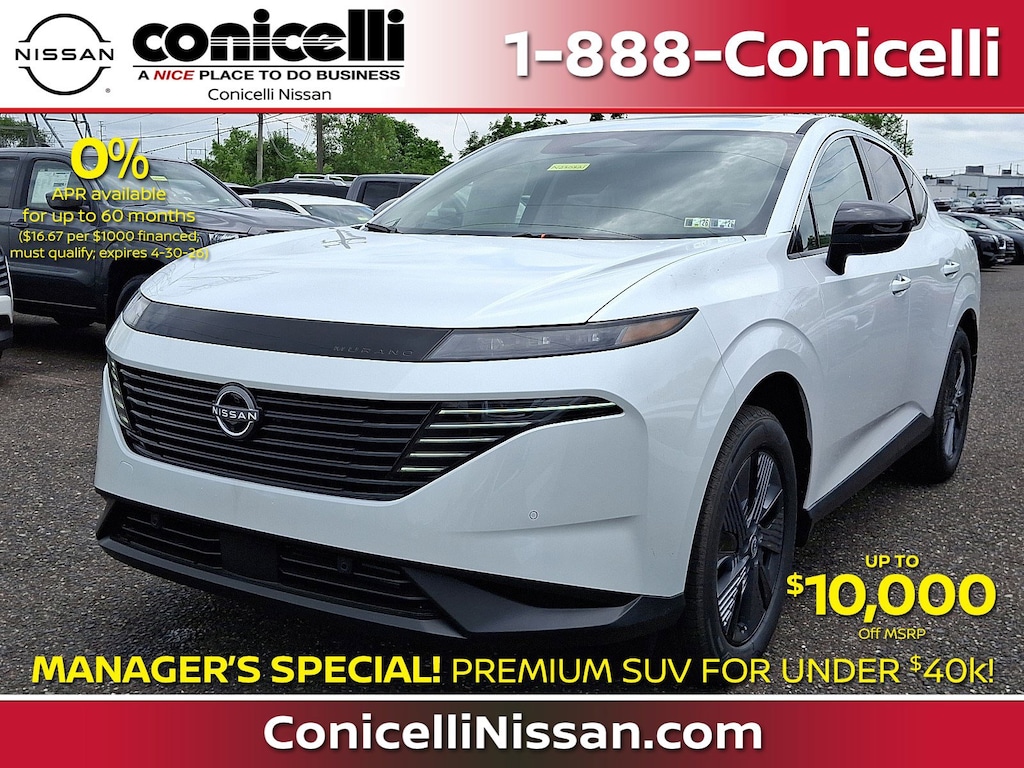 All Nissan Leases, Cash, and APR financing offers: Security deposit waived for customers who qualify for automatic approval. All customers qualify for the Conicelli discount. To purchase vehicle, customer must pay cash, arrange own financing, or have Conicelli arrange financing through one of these preferred lenders: NMAC, PNC, Bank of America, Wells Fargo, Chase, Ally Bank, Citadel. Lease and finance offers are subject to approval by Nissan Motor Acceptance Corporation (NMAC) Tier 1 or Tier 2 credit requirements. Not all customers will qualify and are subject to credit approval determined by NMAC. Manufacturer incentives and rebates may already be included in payment, and additional manufacturer incentives may be available for qualifying customers. These can be verified by contacting Conicelli via phone, email, website, or visiting the dealership for the most accurate and up-to-date information. Customer Bonus Incentive cannot be combined with special APR or lease offers unless explicitly stated. Customers selecting this incentive must finance at standard rates to qualify. Tax, tags, and title extra. $490 doc fee included. Offers are valid for in-stock vehicles only and cannot be substituted. Excludes prior purchases. Out-of-state residents should contact Conicelli for details. Vehicle availability is subject to change without notice due to demand, inventory, or other factors. Contact Conicelli to confirm availability of current promotions, offers, and vehicles. While we strive for accuracy, errors in pricing, offers, or descriptions may occur. Customers are encouraged to verify all details directly with the dealership. Images are for illustrative purposes only and may not represent the exact vehicle, trim, or color available. All offers subject to change by lender or credit union approval. Lease payments based on current residuals and money factors at time of publication. Programs may change at any time without notice.
