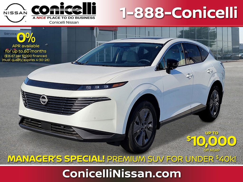 All Nissan Leases, Cash, and APR financing offers: Security deposit waived for customers who qualify for automatic approval. All customers qualify for the Conicelli discount. To purchase vehicle, customer must pay cash, arrange own financing, or have Conicelli arrange financing through one of these preferred lenders: NMAC, PNC, Bank of America, Wells Fargo, Chase, Ally Bank, Citadel. Lease and finance offers are subject to approval by Nissan Motor Acceptance Corporation (NMAC) Tier 1 or Tier 2 credit requirements. Not all customers will qualify and are subject to credit approval determined by NMAC. Manufacturer incentives and rebates may already be included in payment, and additional manufacturer incentives may be available for qualifying customers. These can be verified by contacting Conicelli via phone, email, website, or visiting the dealership for the most accurate and up-to-date information. Customer Bonus Incentive cannot be combined with special APR or lease offers unless explicitly stated. Customers selecting this incentive must finance at standard rates to qualify. Tax, tags, title, and $490 doc fee extra. Offers are valid for in-stock vehicles only and cannot be substituted. Excludes prior purchases. Out-of-state residents should contact Conicelli for details. Vehicle availability is subject to change without notice due to demand, inventory, or other factors. Contact Conicelli to confirm availability of current promotions, offers, and vehicles. While we strive for accuracy, errors in pricing, offers, or descriptions may occur. Customers are encouraged to verify all details directly with the dealership. Images are for illustrative purposes only and may not represent the exact vehicle, trim, or color available. All offers subject to change by lender or credit union approval. Lease payments based on current residuals and money factors at time of publication. Programs may change at any time without notice.